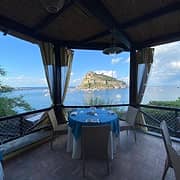 Ristorante con vista sul Castello Aragonese e piattaforme solarium sul mare. Si raggiunge sia via terra che via mare col servizio barca offerto dal ristorante. Atmosfera rilassata, piatti della tradizione.